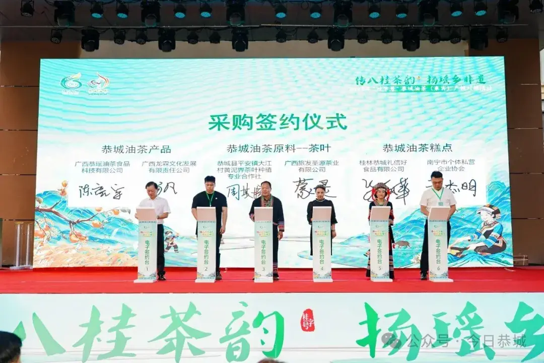 在签约仪式上,恭城油茶协会以及桂林新欧记食品有限公司、桂林品华油茶供应链管理有限公司、桂林恭城御品油茶食品科技有限公司、广西恭瑶油茶食品科技有限公司、恭城县平安镇大江村黄泥界茶叶种植专业合作社、桂林恭城礼信好食品有限公司6家企业与多家采购商代表现场签署合作协议,达成恭城油茶系列产品购销合作意向。据统计,本次意向签约金额累计达5700万元。