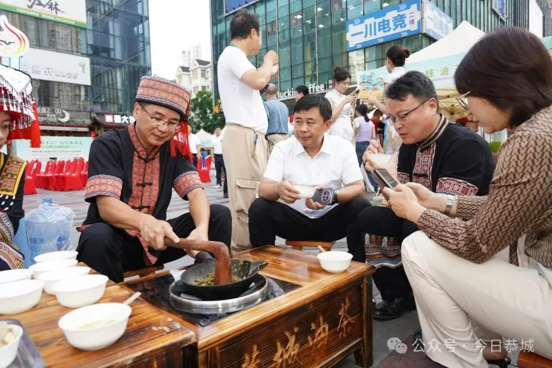 活动现场,茶香四溢,人气鼎沸。此次产销对接活动围绕“展示、品鉴、洽谈、签约、直播、展演”六大板块展开,内容丰富、形式多样。现场还邀请了多家油茶生产企业与区内外采购商进行现场产销精准对接。设置油茶制作体验区,由恭城油茶非遗传承人现场展示传统打油茶技艺,让观众亲身体验制作过程,品尝地道恭城油茶,感受瑶乡饮食文化的独特魅力。